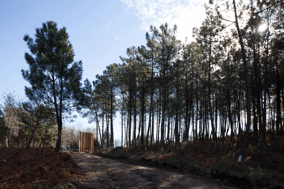 Na primeira visita ao local onde se encontra a peça “Ver através da árvore”, Dalila Gonçalves retomou a memória da caminhada a Santiago que fizera muitos anos antes. Lembrou-se do movimento duro da descida que se segue a uma desgastante subida, da pedra – junto à qual está a sua peça – como um momento de pausa, das árvores e da mata que pautavam o caminho. Tentou perceber ao máximo as sensações e as características do local para que, através dessa relação emocional, pudesse conceber uma peça para o local. De certo modo, de forma mais ou menos inconsciente, acredita que estas memórias estão dentro da sua escultura. A obra tem uma relação bastante direta com os materiais do lugar, com a verticalidade da floresta e com o movimento descendente e em curva do caminho. A artista procurou agarrar nas características do espaço, organizá-las de outra maneira e devolvê-las ao ponto de partida. Acentuou o movimento e a curva do caminho pela forma e pela disposição das árvores numa espécie de fole. Um fole de madeira que podemos imaginar a correr e a desenhar a paisagem como um portão sobre a calha da sua base. As tábuas na vertical guardam em si os contornos e as “imperfeições” das árvores que lhe deram origem, como se as abríssemos para que as pudéssemos ver por dentro. Por entre as tábuas, há frechas que deixam passar os raios de luz e projetam as suas sombras. Não as podemos fechar nem mover, mas podemos ver através delas, como se espreitássemos com um olho cerrado por detrás de uma árvore. Um jogo de contacto com a natureza, de refúgio, de aparição e esconderijo como um qualquer jogo de criança que, ao mesmo tempo que se esconde, procura, através de um olhar analítico, o que está para lá da montanha. Conceber objetos que nem sempre implicam a transformação real das coisas, que se concretizam, em muitos casos, pelo simples uso inesperado, irónico, absurdo ou metafórico da matéria, faz parte do processo de trabalho da artista. Pela subtileza da informação utilizada, pela natureza dos materiais, ou pelo simples modus operandi são frequentes os jogos com a própria “perceção” e a ideia de “evidência”. Será, porventura, nestes momentos de estranheza, nessa espécie de fronteira entre a realidade física e a ficção, que são ativados os mecanismos do sentir e do pensar que aferem significado ao objeto artístico.
